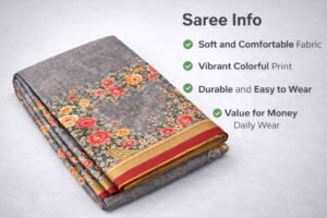 This saree is ideal for women who prefer lightweight and comfortable clothing with elegant designs. The floral print adds charm, while the soft fabric keeps you comfortable throughout the day. Suitable for housewives, working women, and anyone searching for reliable daily wear sarees.